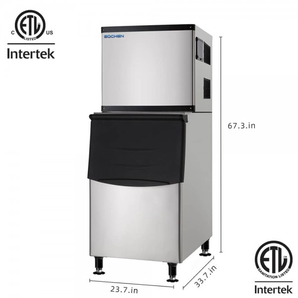 - Efficient ice-making capability: 350lbs/24hours, Storage:230lbs, Ambient temperature 70℉, water temperature 50℉.A reliable refrigeration system ensures a high-speed and stable refrigerating process, and a reasonable ice-making method ensures high-quality and smooth ice output