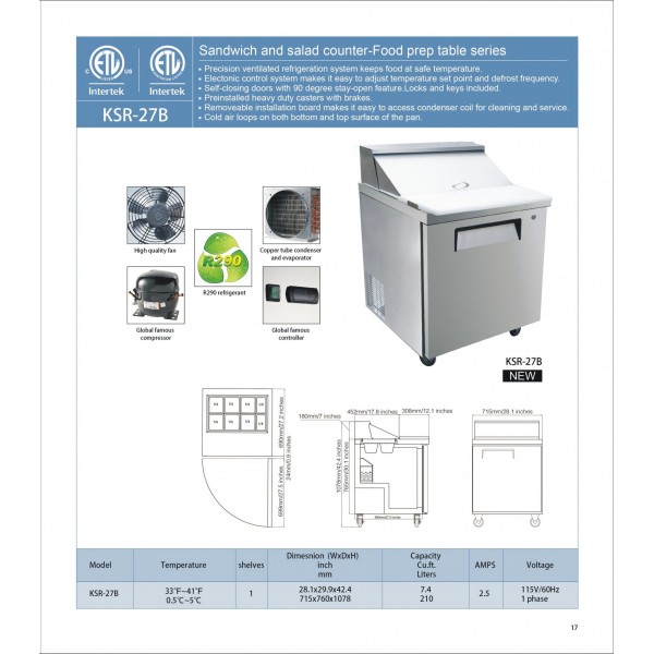 Eqchen KSR-27B, Commercial 28" 8 Pan Salad Sandwich Food Prep Table Refrigerator 7.5 cu.ft. NSF