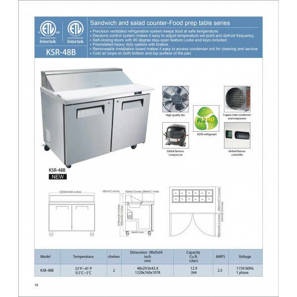 Eqchen - KSR-48B, Commercial 48" 12 Pan Salad Sandwich Food Prep Table Refrigerator 12.9cu.ft.
