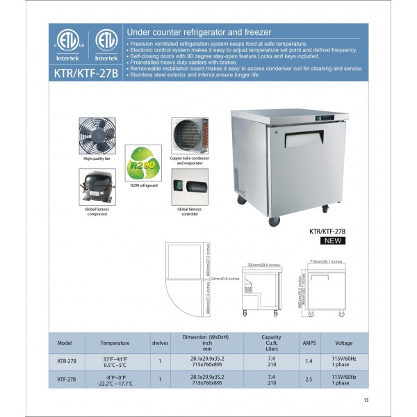 Eqchen - KTF-27B, Commercial 28" Undercounter Worktop Freezer 7.4 cu.ft NSF