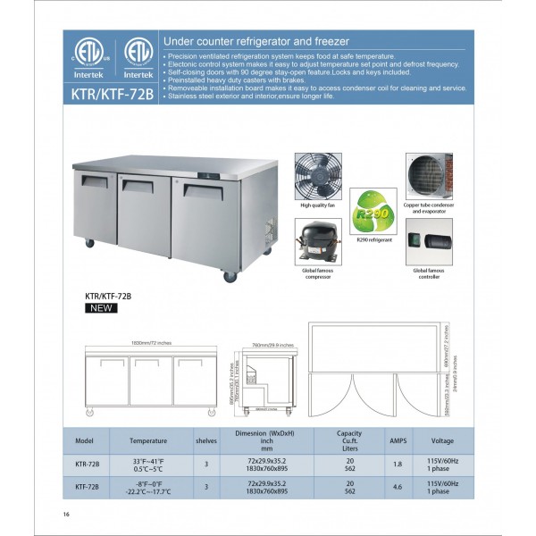 Eqchen KTF-72B, Commercial 72" Undercounter Worktop Freezer 20 cu.ft. NSF