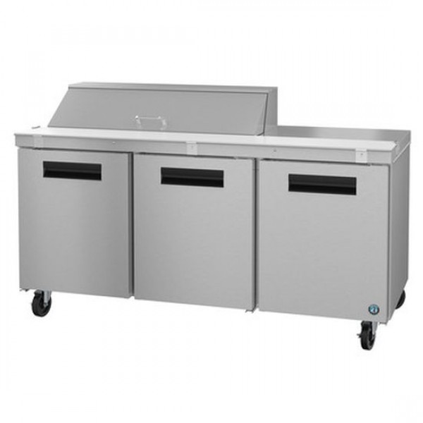 Hoshizaki SR72A-12 72" Steelheart Series Three-Section Sandwich Top Prep Table Refrigerator with 3 Stainless Doors & 12 Pan Capacity - 21 Cu. Ft.