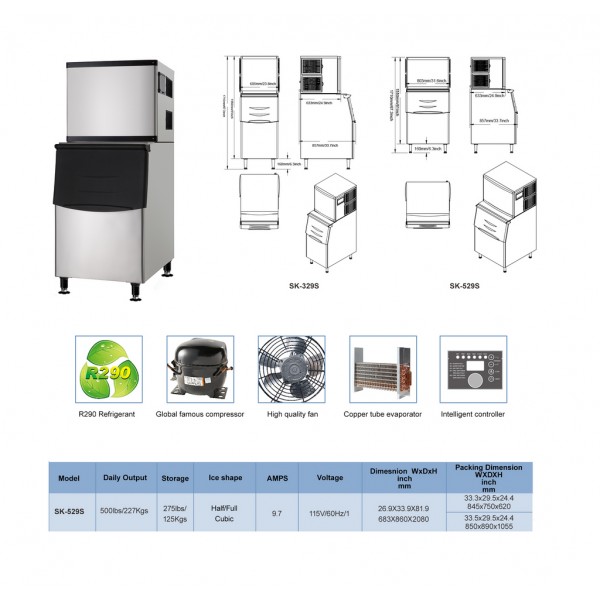 2.Ice storage capacity: 275 lbs. Size: 30" x 32.7'' x 45.3''.