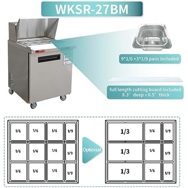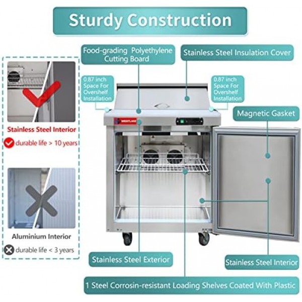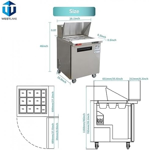 WESTLAKE 27" W Mega Top Sandwich & Salad Prep Table Commercial Single Door Mega Top Refrigerator Stainless Steel Counter Fan Cooling with 12 pans-27 Large Capacity Inches for Restaurant.