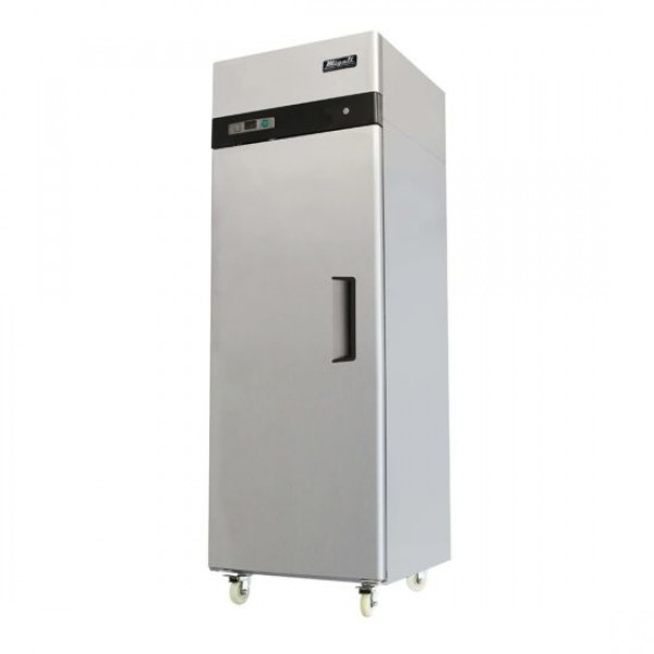 Be it either for a celebrity chef's kitchen or your small cozy restaurant, Migali one door commercial reach-in refrigerator, is an ideal choice for storing all your favorite foods. Whether precooked or par-cooked, excess or leftovers, this refrigerator takes in all. It comes with a capacity of 23 cubic feet, together with spacious cabinets and adjustable shelves. Less heat-producing LED bulbs, help you find the items without a hitch. Easier to clean bottom mount compressor provides power for hot kitchen environments. The refrigerator is entirely made of stainless steel along with embedding on the inside of door lines. To give this unit, one heck of strength and integrity, 2" foamed in place polyurethane is used for insulation on the interior of the box for prevention of heat loss. The whole unit has a programmable controller featuring condenser cleaning alerts, temperature controls, choice of unit measures, and more.
