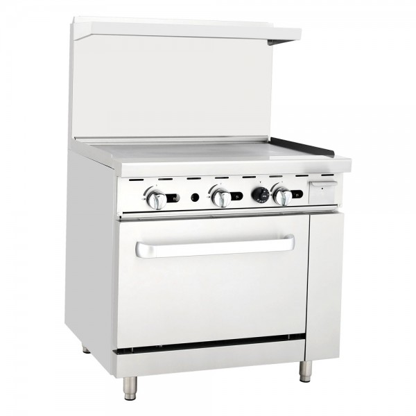 Simmer, saute, grill, flip, whip, bake all at one time. Be the goddess of your kitchen and dance around multitasking the chores. Migali's griddle combined oven ranges lets you all these task effortlessly and flawlessly. The model powered by natural gas features an oven with adjustable racks for baking multiple cakes at a time, 36" wide and 3/4" thick polished griddle for flipping the burger patties which can be controlled manually by chrome temperature knobs. The cast iron grates can be uninstalled and reinstalled easily for cleaning purposes. The four adjustable legs of the unit helping in easy moving while reorganizing the layout of the kitchen. The wall beyond the assembly stays cleans because of rear located backsplash and heat is transferred to the hood ventilation system. The whole interior and exterior is made of heavy duty durable stainless steel.