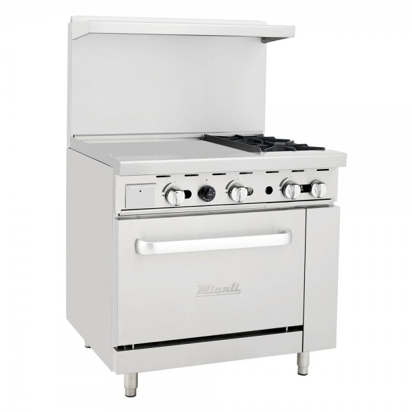 Simmer, saute, grill, flip, whip, bake all at one time. Be the goddess of your kitchen and dance around multitasking the chores. Migali's burner combined griddle and oven ranges lets you all these task effortlessly and flawlessly. The model powered by liquid propane features an oven with adjustable racks for baking multiple cakes at a time, 24" wide and 3/4" thick polished griddle for flipping the burger patties and two burners which operate at 23,000 BTU alone and can be controlled manually by chrome temperature knobs. The cast iron grates can be uninstalled and reinstalled easily for cleaning purposes. The four adjustable legs of the unit helping in easy moving while reorganizing the layout of the kitchen. The wall beyond the assembly stays cleans because of rear located backsplash and heat is transferred to the hood ventilation system. The whole interior and exterior is made of heavy duty durable stainless steel.