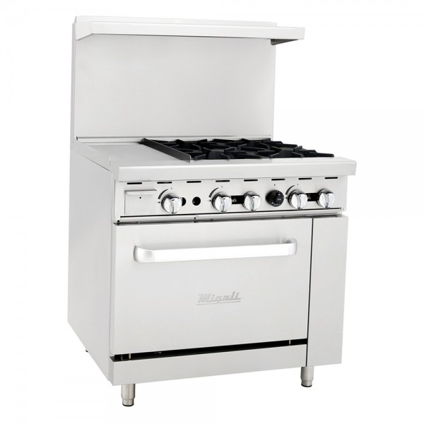 Simmer, saute, grill, flip, whip, bake all at one time. Be the goddess of your kitchen and dance around multitasking the chores. Migali's burner combined griddle and oven ranges lets you all these task effortlessly and flawlessly. The model powered by natural gas features an oven with adjustable racks for baking multiple cakes at a time, 12" wide and 3/4" thick polished griddle and flipping the burger patties and four burners which operate at 25,000 BTU alone and can be controlled manually by chrome temperature knobs. The cast iron grates can be uninstalled and reinstalled easily for cleaning purposes. The four adjustable legs of the unit helping in easy moving while reorganizing the layout of the kitchen. The wall beyond the assembly stays cleans because of rear located backsplash and heat is transferred to the hood ventilation system. The whole interior and exterior is made of heavy duty durable stainless steel.
