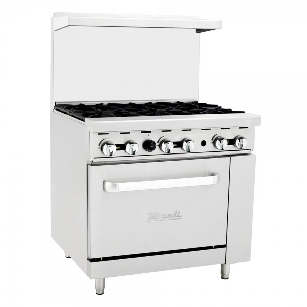 Simmer, saute, grill, flip, whip, bake all at one time. Be the goddess of your kitchen and dance around multitasking the chores. Migali's burner combined oven ranges lets you all these task effortlessly and flawlessly. The model powered by liquid propane features an oven with adjustable racks for baking multiple cakes at a time, and six burners which operate at 23,000 BTU alone and can be controlled manually by chrome temperature knobs. The cast iron grates can be uninstalled and reinstalled easily for cleaning purposes. The four adjustable legs of the unit helping in easy moving while reorganizing the layout of the kitchen. The wall beyond the assembly stays cleans because of rear located backsplash and heat is transferred to the hood ventilation system. The whole interior and exterior is made of heavy duty durable stainless steel.