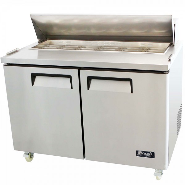 Migali's commercial sandwich prep table to your restraint kitchen today for every customer who wishes to wander the block with a sandwich in a hand- the perfect to-go food of times known ever. The unit is designed to have a top cutting board space, a separate area devoted to pans and pots, and a refrigerated storage base for storing and keeping fresh all the olives, pickles, veggies, slices of bacon, hams, turkey, and more. The rail accommodates 12 pans for storage with adjustable rail adaptor bars. The unit comes with two hinged solid door with recessed handles that can stay open for easy stocking purposes and a forced air cooling system for uniform temperature distribution and a compressor that features a unique R290 hydrocarbon refrigerant which being eco-friendly will cut cost on your next energy consumption cycle.