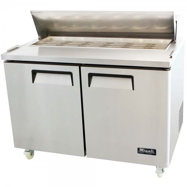 Migali's commercial sandwich prep table to your restraint kitchen today for every customer who wishes to wander the block with a sandwich in a hand- the perfect to-go food of times known ever. The unit is designed to have a top cutting board space, a separate area devoted to pans and pots, and a refrigerated storage base for storing and keeping fresh all the olives, pickles, veggies, slices of bacon, hams, turkey, and more. The rail accommodates 16 pans for storage with adjustable rail adaptor bars. The unit comes with two hinged solid door with recessed handles that can stay open for easy stocking purposes and a forced air cooling system for uniform temperature distribution and a compressor that features a unique R290 hydrocarbon refrigerant which being eco-friendly will cut cost on your next energy consumption cycle.