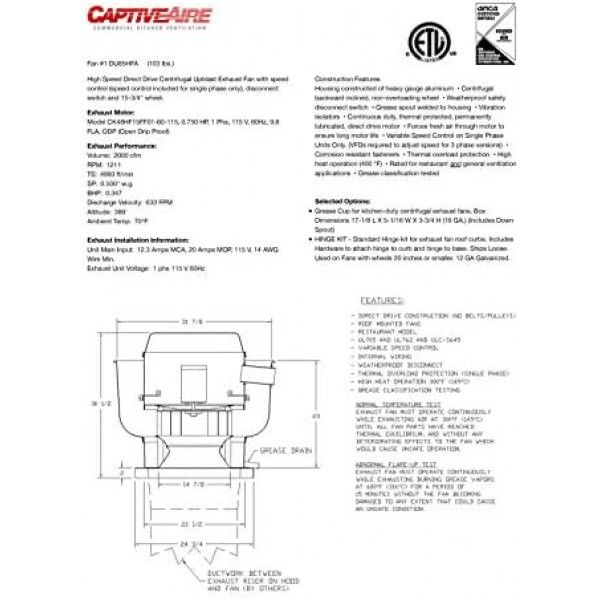 - Rated for restaurant grease and general ventilation applications. UL705, UL762, & ULC-S645 Rated. Included with the exhaust fan is a restaurant duty grease cup, down spout, and a hinge kit for exhaust fan roof curbs.