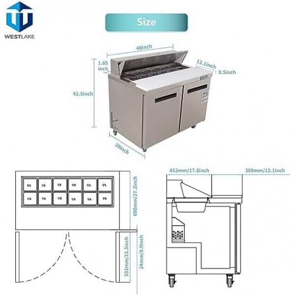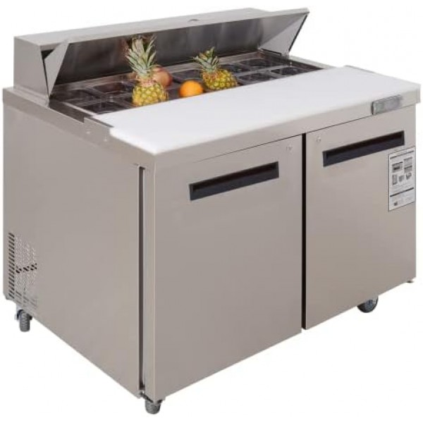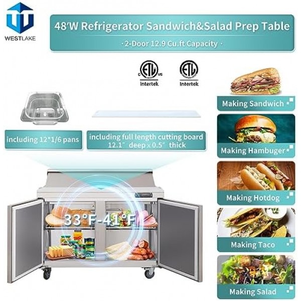 WESTLAKE 48" W 2 Door Refrigerator Sandwich & Salad Prep Table Commercial Stainless Steel Counter Fan Cooling Refrigerator with 12 pans-48 Inches for Restaurant, Bar, Shop, etc
