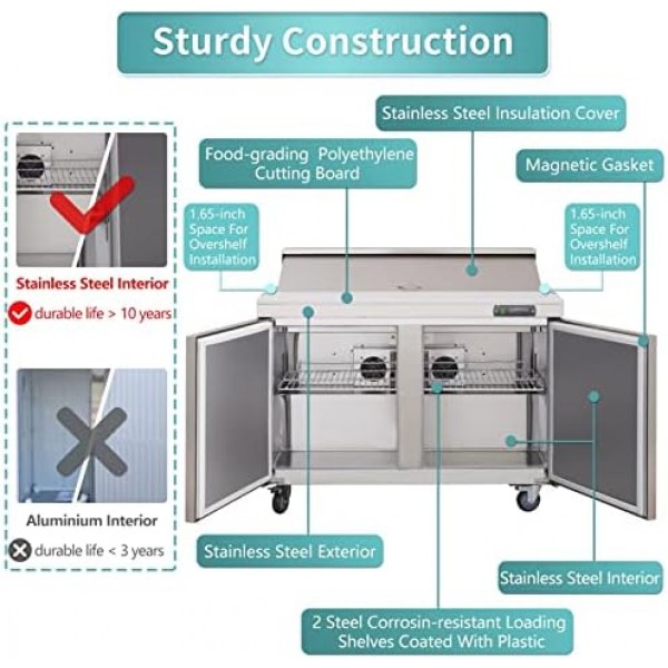 - ultra-large refrigerator capacity: Food prep table equipped with 2 shelves and 8 shelf clips, allowing you to place your shelves exactly where you need them to accommodate your small or large food products. Shelves are coated with corrosion-resistant plastic, and the loading capacity is a maximum of 90 lbs.