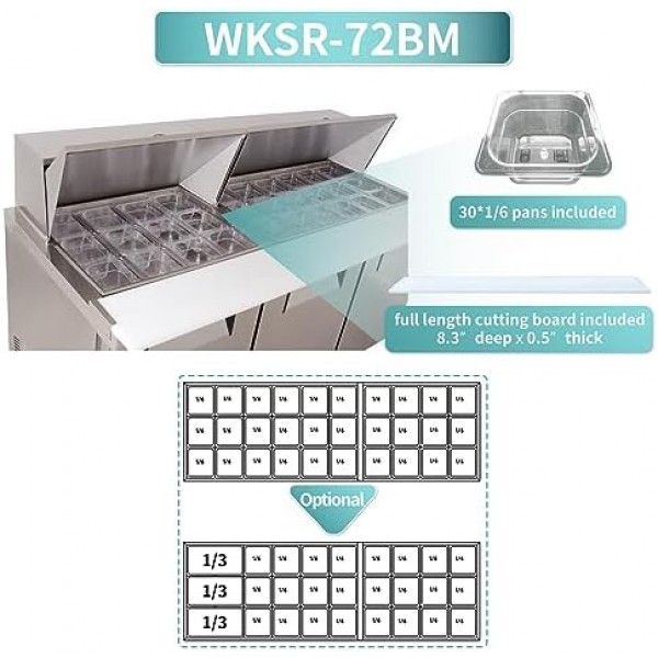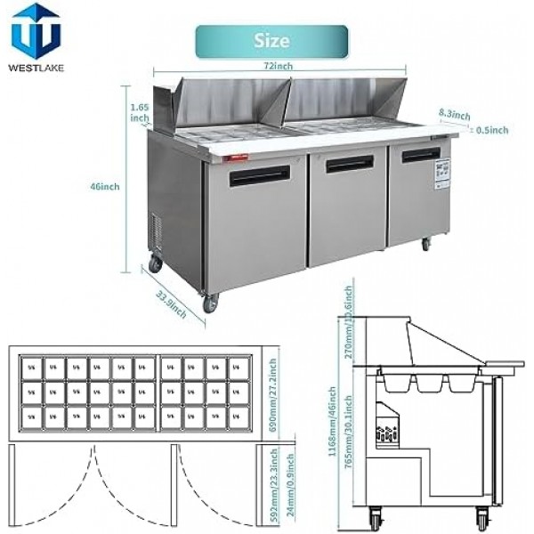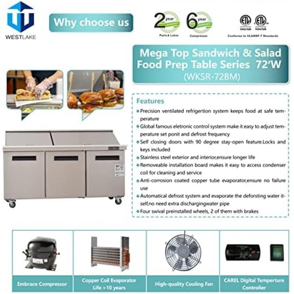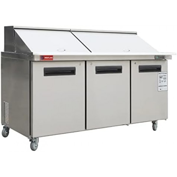 Sandwich Prep Table Refrigerator, WESTLAKE WKSR-72BM 3 Door 72" Mega Top Salad Sandwich Prep Table with 30 Pans