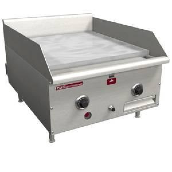 This griddle also features a 1” thick polished rolled steel plate, 5” high rear, 4” side splash guards, 3/4” rear gas connection and pressure regulator. The exclusive “NO COLD” Zone has uniform heat distribution across the surface. Each burner is equipped with runner tube and grease drawers that are equipped with large capacity. Fully welded griddle plate with protected exhaust vent.