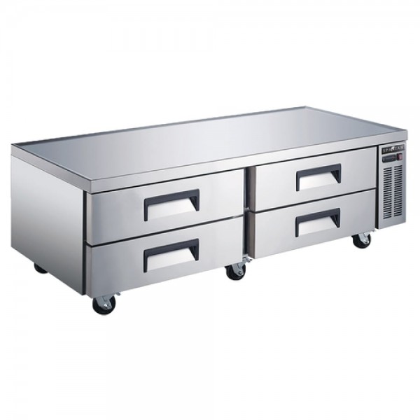 Spartan Refrigeration, SCB-72, Refrigerated Chef Base, 72.5"W, side mounted self-contained refrigeration, stainless steel marine edge top, (4) drawers - each accommodates (8) 1/1 pans, digital thermostat, stainless steel interior & exterior, (4) casters, R290 Hydrocarbon refrigerant, 1/5 HP, 115v/60/1-ph, 6.4 amps, cord, NEMA 5-15P, cETLus, ETL-Sanitation