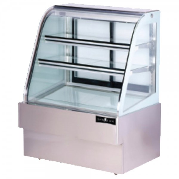 Spartan Refrigeration, SD-36, Curved Glass Deli Case, 35-2/5", bottom mounted self-contained refrigeration, anti-fog glass face, (2) adjustable glass shelves (12" & 16") plus 21" base, interior lighting, digital temperature display, (2) rear doors, 201 stainless steel exterior, R290 Hydrocarbon refrigerant, (4) casters, 3/8 HP, 110v/60/1-ph, 6.0 amps, NEMA 5-15P, cETLus, ETL-Sanitation