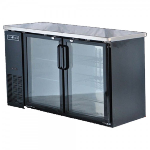 Spartan Refrigeration, SGBBB-48, Back Bar, 48.8", two-section, 11.8 cu. ft., left side mounted self-contained refrigeration, hinged anti-fog glass doors, (4) adjustable shelves, digital temperature control, interior lighting, stainless steel top, black vinyl exterior, 304 stainless steel interior, R290 Hydrocarbon refrigerant, 1/3+ HP, 115v/60/1-ph, 7.2 amps, NEMA 5-15P, cETLus, ETL-Sanitation