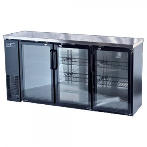 Spartan Refrigeration, SGBBB-72, Back Bar, 72.75", three-section, 19.6 cu. ft., left side mounted self-contained refrigeration, hinged anti-fog glass doors, (6) adjustable shelves, digital temperature control, interior lighting, stainless steel top, black vinyl exterior, 304 stainless steel interior, R290 Hydrocarbon refrigerant, 1/3+ HP, 115v/60/1-ph, 8.0 amps, NEMA 5-15P, cETLus, ETL-Sanitation