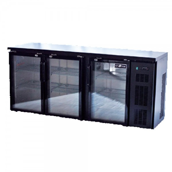 Spartan Refrigeration, SGBBB-79-SL, Refrigerated Back Bar Cooler, Shallow Depth, 78.8", three-section, 18.0 cu. ft., side mounted self-contained refrigeration, hinged anti-fog glass doors, (6) adjustable shelves, digital temperature control, interior lighting, black vinyl exterior, 304 stainless steel interior, R290 Hydrocarbon refrigerant, 1/3+ HP, 110v/60/1, 3.5 amps, NEMA 5-15P, cETLus, ETL-Sanitation