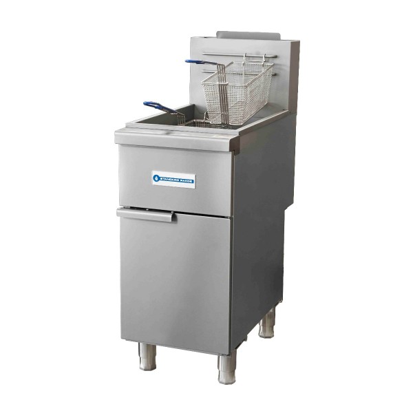 Keep your customers supplied with freshly fried foods using the Standard Range split pot floor fryer. The Standard Range commercial restaurant fryer is designed to handle deep frying tasks in busy commercial establishments. Standard features within this model include two nickel plated baskets, standing pilot light design that provides a ready flame when needed, built-in heat deflectors, and individual gas control valves. Stainless steel front, door, and side construction makes this model easy to clean while also protecting from rust and corrosion. What's more, every unit of the Standard Range Fryer can be cleaned and wiped down by hand. Ample code zones and sloping bottoms help collect and get rid of sediment from fry-pots in order to safeguard oil quality.
