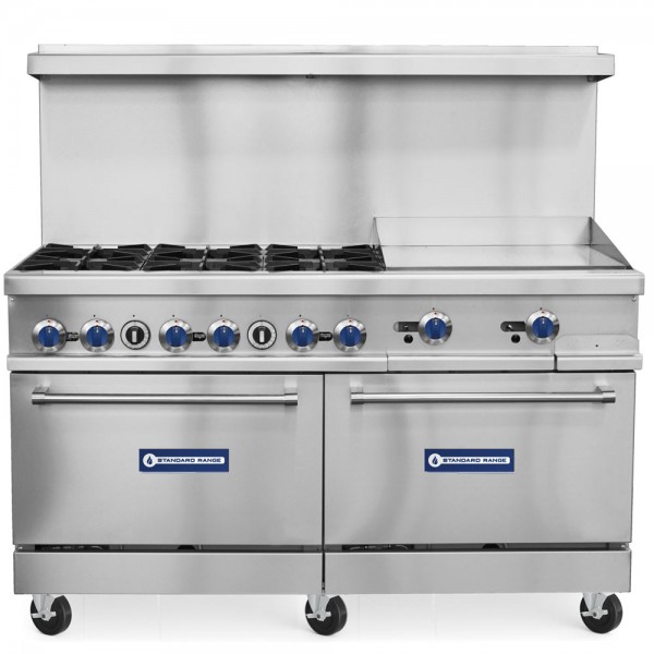 Standard Range 60" commercial range with 24" flat top griddle, 6 open high BTU burners, and two full size ovens.