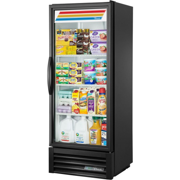 Display merchandise and encourage impulse sales of cold drinks, sandwiches, and other to-go items with the True GDM-12-HC~TSL01 refrigerated glass door merchandiser! This unit's stylish black/white exterior is coated with non-peel cold rolled steel that is guaranteed to protect your long-term investment. Featuring a positive seal, self-closing door, this True commercial refrigerator comes with a “Low-E” double pane thermally-insulated glass door. This assembly has a mitered plastic channel frame featuring the latest in energy efficient technology. With an extra-large evaporator coil balanced with a higher horsepower compressor, this glass door merchandiser has a large condenser with a factory engineered, self-contained, capillary tube system.