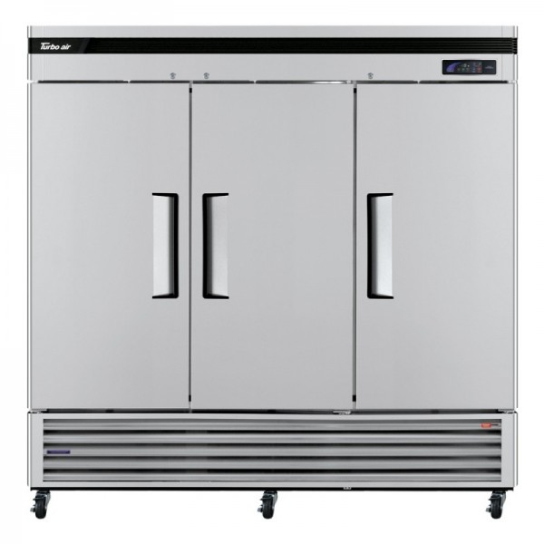 The Turbo Air commercial 3 Swing Doors Reach-in Bottom mount refrigerator that ensures food safety and provides a convenient cold holding system. This Super Deluxe 82" wide commercial cooler is equipped with 9 shelves that provide added storage flexibility. It offers 63.8 Cu.Ft. of storage space to suit the needs of your establishment. Equipped with a door pressure release device that eliminates vacuum pressure inside and allows easy door opening. LED interior lighting illuminates the stored items that makes it easy to locate them. A self- cleaning condenser automatically brushes daily in order to keep the device clean as well as prevent system failure. The digital temperature control and monitor system allows easy monitoring and maintains constant temperatures that keep food safe from spoilage. High-density polyurethane insulates the entire unit that maintains constant inner temperatures.. Because it runs on eco-friendly hydrocarbon (R290) refrigerant, this restaurant fridge is a great product choice for businesses that care about the environment. At Kitchenall, we deliver the Turbo Air with a crated weight of 639 Ibs and other commercial Reach-In Bottom mount refrigeration cabinet at wholesale pricing to locations within the US and Canada. Shipping of all units is within 24 hours.Standard Features