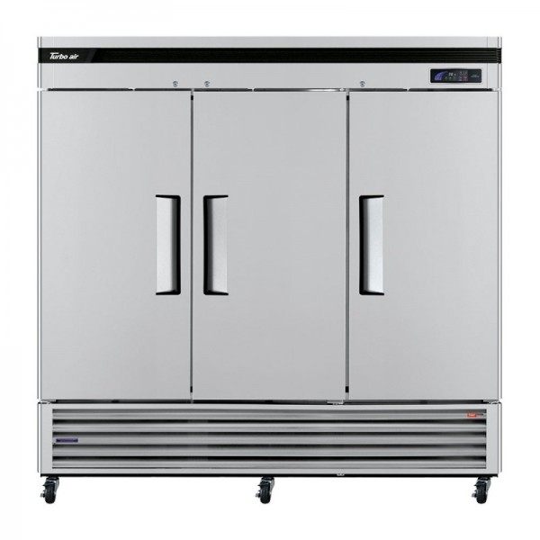 The Turbo Air TSR-72SD-N commercial 3 Swing Doors Reach-in Bottom mount refrigerator that ensures food safety and provides a convenient cold holding system. This Solid Door Refrigerator 82" wide commercial cooler is equipped with 9 shelves that provide added storage flexibility. It offers 64.1 Cu.Ft. of storage space to suit the needs of your establishment. Equipped with a door pressure release device that eliminates vacuum pressure inside and allows easy door opening. LED interior lighting illuminates the stored items that makes it easy to locate them. A self- cleaning condenser automatically brushes daily in order to keep the device clean as well as prevent system failure. The digital temperature control and monitor system allows easy monitoring and maintains constant temperatures that keep food safe from spoilage. High-density polyurethane insulates the entire unit that maintains constant inner temperatures.. Because it runs on eco-friendly hydrocarbon (R290) refrigerant, this restaurant fridge is a great product choice for businesses that care about the environment. At Kitchenall, we deliver the Turbo Air TSR-72SD-N with a crated weight of 602 Ibs and other commercial Reach-In Bottom mount refrigeration cabinet at wholesale pricing to locations within the US and Canada. Shipping of all units is within 24 hours.Standard Features