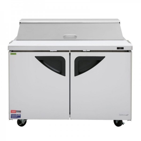 Bring efficiency to your sandwich and salad preparation routines with the Turbo Air TST-48SD-N Food Prep Table. This unit is ideal for sandwich shops and pizzerias that offer a selection of ingredients and toppings. It measures 48" wide and can accommodate up to 12 food pans for added convenience. 2 Swing Doors provides easy access to your stored ingredients, with 2 shelves for added storage flexibility. This models delivers a 12 Cu. Ft. storage capacity and comes with a self cleaning condenser to prevent system failure due to accumulation of dust, cold bunker system to prevent food spoilage, and a digital temperature control system for easier monitoring and regulation. LED interior lighting illuminates every corner for easy access while the fan control unit helps maintain cool inner temperatures. An insulated pan cover prevents heat transfer from outside - keeping ingredients fresh. If you are looking for a dependable food prep table to suit the food preparation needs in your establishment, the TST-48SD-N is an excellent product choice. Kitchenall, delivers this Turbo Air model at wholesale pricing to locations within the US and Canada.Standard Features
