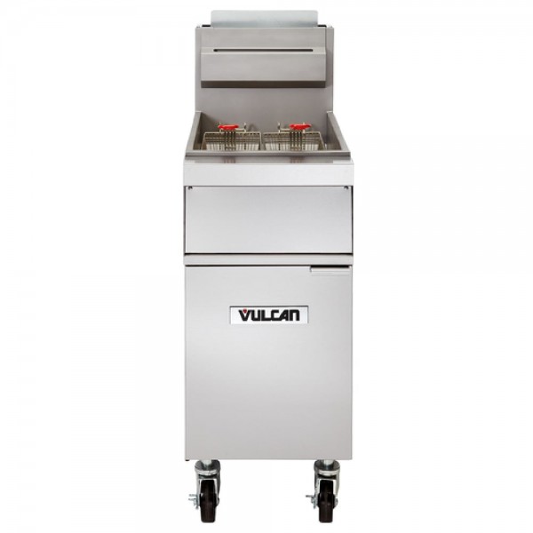 With both a cabinet and a fry tank that are constructed out of stainless steel, this fryer is built to last for years of cooking various foods for customers. The V shaped design of the cold zone ensures that all crumbs and debris will fall away from the baskets, and the three heat exchanger tubes provide even heat distribution throughout the tank so products are cooked perfectly each and every time. The tank can hold 65 to 70 pounds of oil, and the ball-type drain valve makes it easy to evacuate oil and thus cleaning the tank out a breeze when needed. The snap-action thermostat controls are easy to operate and the casters let you roll this appliance wherever it would be the most convenient for you and your staff members. For a fryer that will prove reliable and give you an efficient way to cook chicken, fish, appetizers, and French fries, then purchase the Vulcan-Hart 1GR65M.