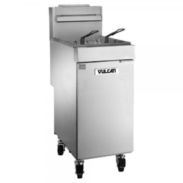 The 1VEG35M is a 15-1/2" wide, ENERGY STAR certified VEG series free standing single tank gas fryer from Vulcan with a millivolt thermostat control with hi-limit shut-off. There is a built-in flue deflector and a stainless steel fry tank on the ENERGY STAR certified VEG series free standing single tank gas fryer with a 35-40 lb capacity.