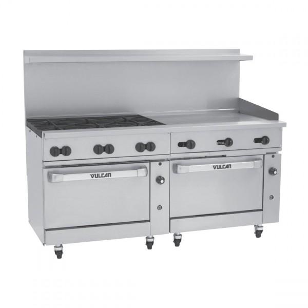 Being able to find an oven range that can handle the busiest of meal rushes can be a challenge. It has to sauté, boil, simmer, fry, bake, and roast for hours upon hours on end. It has to be made out of durable materials, and be easy to operate for you and your staff. The more options it offers, the more you'll be able to do, and the more it can specifically meet your restaurants or food service arenas needs. The Vulcan-Hart 72SC-6B36GTP Gas Restaurant Range with dual oven base is potentially the perfect fit, able to do all that you require and more.
