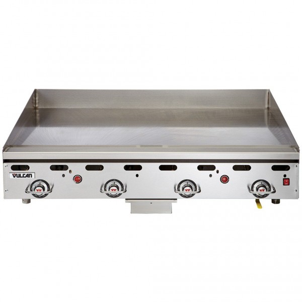 This low-profile griddle features (5) U-shaped burners, which are constructed of aluminized steel. The unit features dual ignition (manual & electronic). Mechanical snap action thermostats are included for every 12” inches, with a temperature range of 200° - 550° F. The front-top ledge features a “Cool Bullnose” design. The grease chute is fully welded in order to stop grease migration.