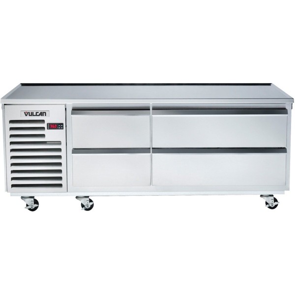 The ARS96 is the Achiever series 96" wide refrigerated base on heavy-duty casters from Vulcan with a dedicated rear-mounted evaporator that circulates cold air through each drawer section.