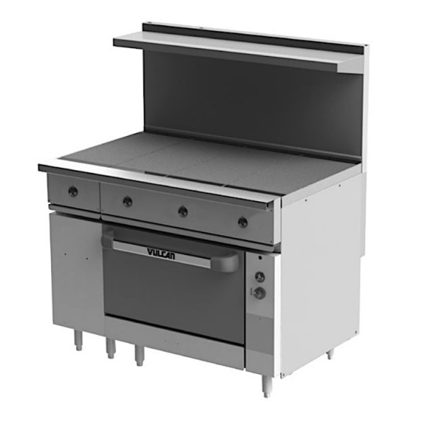The Vulcan EV48S-4HT-480 is an electric restaurant range with four hot tops. This electric restaurant range has a fully MIG welded aluminized steel frame for added durability, along with stainless steel front, sides, back riser, and 6" adjustable legs. The four hot tops are thermostatically controlled, and measure 12" wide by 24" deep. This restaurant range operates on a 480 volt, 60 hertz, 3 phase electrical connection, and must be hardwired.