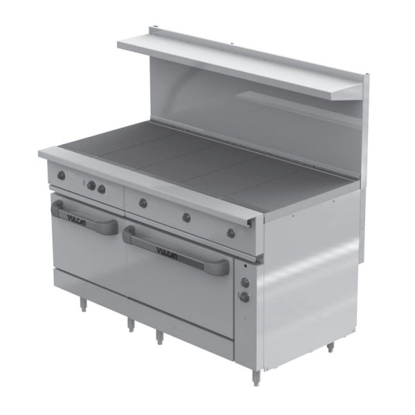 The Vulcan EV60SS-5HT208 is an electric restaurant range with five hot tops. This electric restaurant range has a fully MIG welded aluminized steel frame for added durability, along with stainless steel front, sides, back riser, and 6" adjustable legs. The five hot tops are thermostatically controlled, and each measure 12" wide by 24" deep. Additionally, This electric restaurant range features a dual oven base, with one standard sized oven, and one oversized oven. This restaurant range operates on a 208 volt, 60 hertz, 3 phase (Field convertible to 1 phase) electrical connection, and must be hardwired.