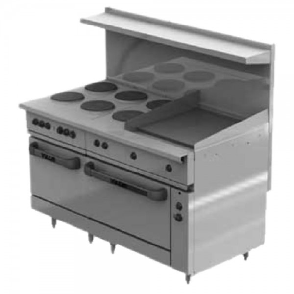The EV60SS-6FP24G208 electric range unit features a dual oven base for your low volume baking and warming needs. The ovens each have a 5 kW output with an adjustable temperature range of 200° - 500° F and cool touch control knobs that allow you to operate the unit more safely and precisely. Inside, this oven has top browning control and a single oven rack with three position options. The range top of this unit features six 9-1/2" french plates with infinite heat control switches, and a 24" thermostatic griddle.