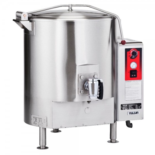 The GS60E is a Fully Jacketed Stationary Kettle from Vulcan that runs on Liquid Propane. This kettle is constructed of stainless steel, including a 316 series steel liner. The interior bottom is sloped to the front, allowing for smooth product flow. A draw-off valve features an opening perforated strainer. This product includes a graduated measuring rod.