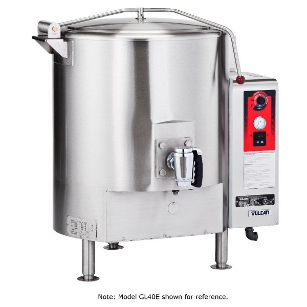 The GT125E is a Fully Jacketed Stationary Kettle from Vulcan that runs on Natural Gas. This kettle is constructed of stainless steel, including a 316 series steel liner. The interior bottom is sloped to the front, allowing for smooth product flow. A draw-off valve features an opening perforated strainer. This product includes a graduated measuring rod.