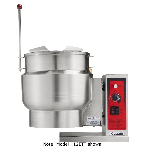 The K20ETT is a Tilting Steam Kettle from Vulcan that runs on Electricity. This countertop kettle is constructed of stainless steel , including a 316 series steel liner, and is 2/3 jacketed. Capacity is 20 gallons. The jacket contains water, antifreeze, and rust inhibitor; offering protection to 30° below zero. The removable elements are field reversible. A mounting base includes lugs, which can be used to bolt the product to either a counter or floor stand. The tilt handle is located on the right side and features an insulated pull knob. The tilt lock can tilt up to 100°.