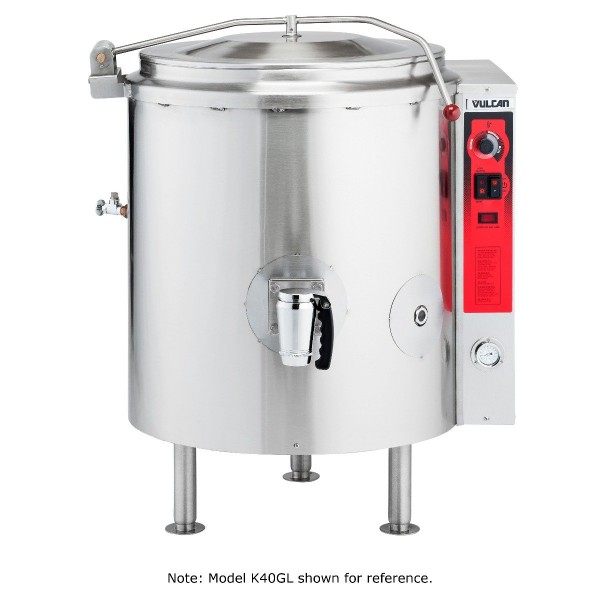The K20GL is a Stationary Gas Kettle from Vulcan that runs on 100,000 BTUs. This kettle is constructed of stainless steel, including a 316 series steel liner. The liner includes an ellipsoidal bottom. The compression draw-off valve features a perforated strainer. True working capacity is 20 gallons. The model is 2/3 jacketed. There is a spring assist cover which includes a condensate ring and a drop-down lift handle. The Power Burning Heating System is designed for high efficiency. This model runs on natural gas, but is field convertible to liquid propane with Span Gas technology.