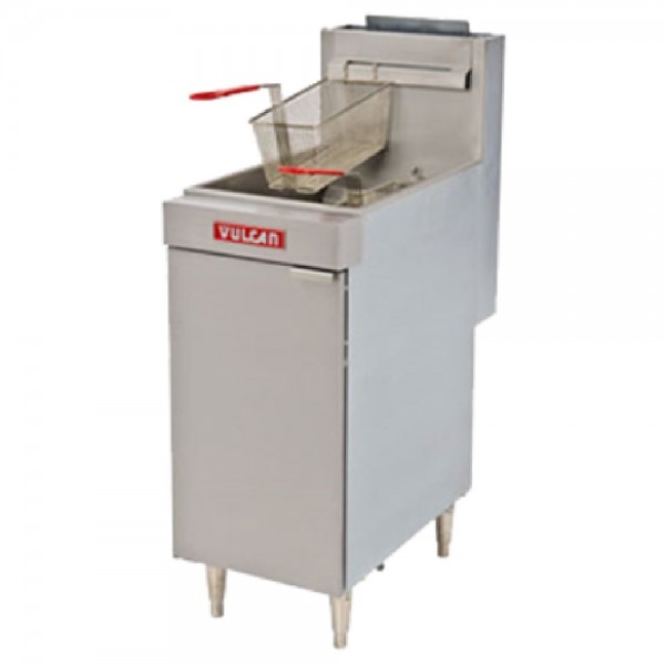 The LG500 is the 21" wide freestanding commercial gas fryer from Vulcan with twin baskets with plastic coated handles and a 19 1/2" x 14" tank with a 65 lb oil capacity. This freestanding commercial gas fryer stands firmly on a set of 4 adjustable nickel-plated legs.