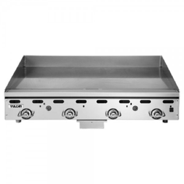 The MSA24-C0100P is a Heavy Duty Countertop Griddle from Vulcan that runs on Liquid Propane. The "Rapid Recovery" composite griddle plate measures at 1” thick. The front, sides, and front grease trough are constructed of stainless steel. There is a pilot safety valve included for every 2 burners, which shuts off gas if the pilot extinguishes. There is also a manual shut-off valve for the gas inlet. Heat shields are located on the bottom. The griddle itself measures 24” x 24”.