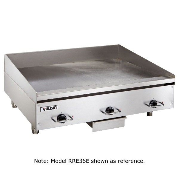 The RRE48E is a 48" wide, heavy-duty electric countertop griddle from Vulcan. This griddle includes a 3/4" thick stainless steel composite plate with a "Rapid Recovery" feature; as well as solid sheathed tubular incoloy heating elements. There is a bottom mounted snap action thermostat every 12" on the cooking surface of the electric countertop griddle. The surface measures 48" x 24". Thermostats can be set from 200 to 450° F.