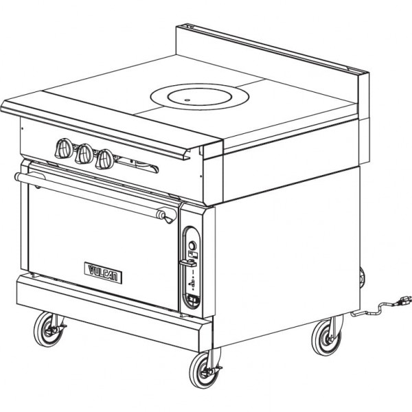 The V1FT36S is the heavy-duty V Series 36" wide gas-powered radial fin French top range from Vulcan that has a Standard oven base, and a 3-ring radial fin French top burner with individual pilots and controls. This range stands firmly on 6" adjustable stainless steel legs.
