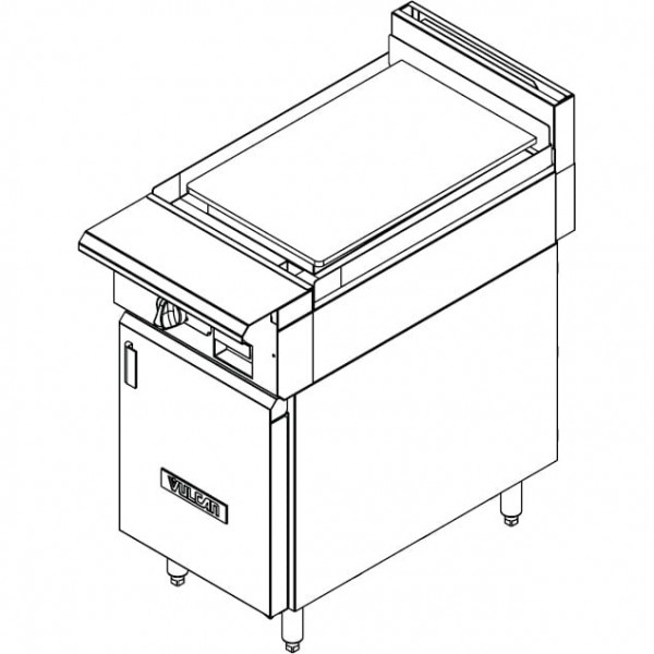 The V1P18B is the heavy-duty V Series 18" wide gas-powered Plancha top range from Vulcan that has a cabinet base, and a 1/2" thick steel plancha top with individual pilots and controls, and a 3-sided grease trough. This cabinet base range stands firmly on 6" adjustable stainless steel legs.