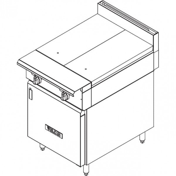 The V224HB is the heavy-duty V Series 24" wide gas-powered full hot top range from Vulcan that has a cabinet base and 2 burners with individual pilots and controls. The range stands firmly on adjustable legs with flanged feet.
