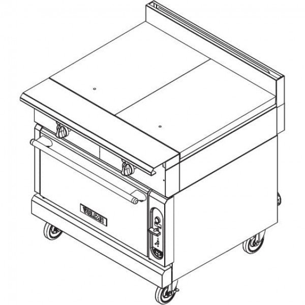This V236HS commercial gas hot top range operates on Natural Gas at 50,000 BTU for the Standard oven and 60,000 BTU/hr for the burners (30,000 BTU per burner) for a total of 110,000 BTU for the unit. The Standard oven has a porcelain interior that is 13" high x 27" wide x 27" deep with a 150 to 550 degree F temperature range.